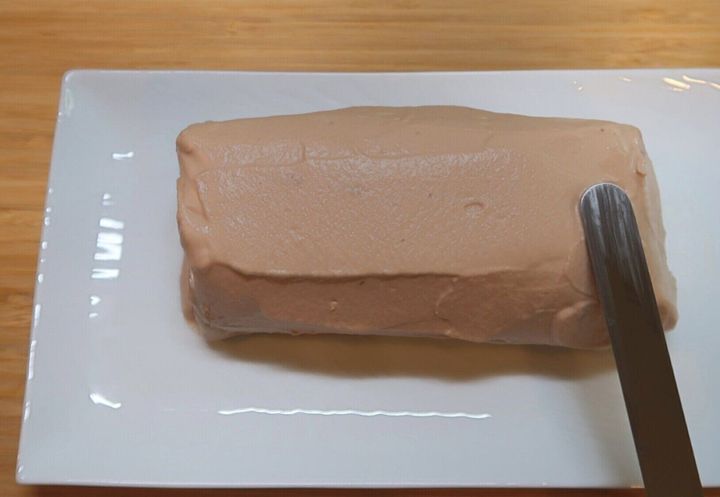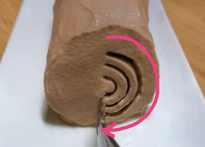 パレットナイフまたはゴムベラを使って全体にチョコクリームを塗ります。あえて塗りあとをのこすと、幹の表面のように見えてより雰囲気がアップします!