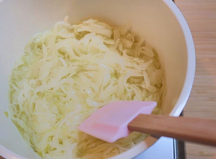 ヘラで玉ねぎをおさえて底全体に広げると、より効率よく炒めることができます。鍋の内側や底にこびりついた旨味も、残さずこそいでとじ込めます。