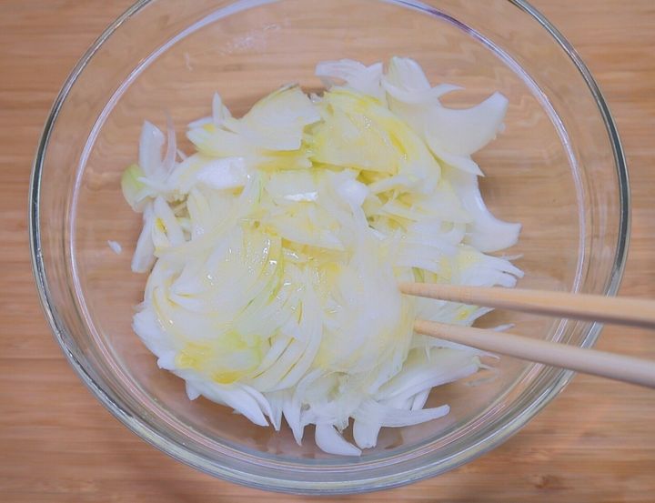 カットした玉ねぎを耐熱ボウルに入れ、オリーブオイル(小さじ2)と塩ひとつまみを加え全体をよく混ぜ合わせます。ふんわりとラップをかけ、600Wの電子レンジで約4分あたためます。一度取り出して全体を混ぜ合わせ、ふたたび約3分加熱します。