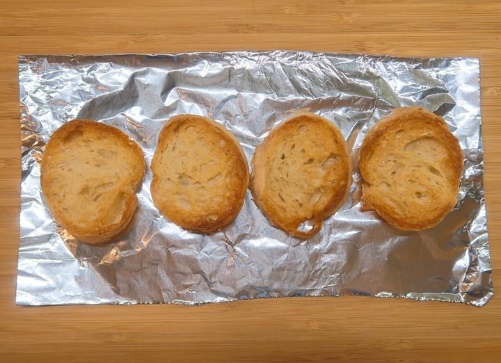 バゲットは、オーブントースターでこんがり色づくまで焼きます。カリッと焼くことで水分がとび、よりスープがしみ込みやすくなります!