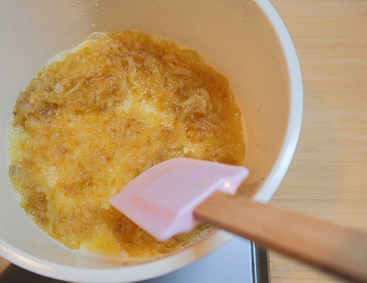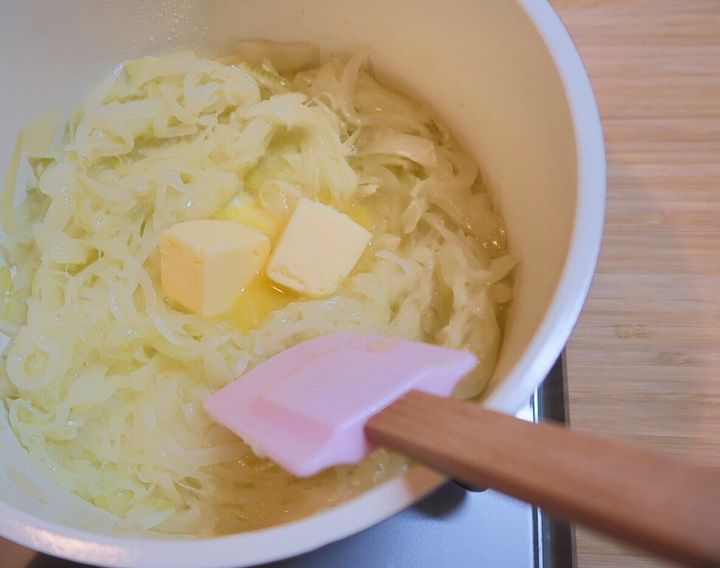 つづいて分量のバターを加え、ときどき混ぜながら弱火で25〜30分炒めます。じっくり炒めることで玉ねぎの旨味を引き出します。