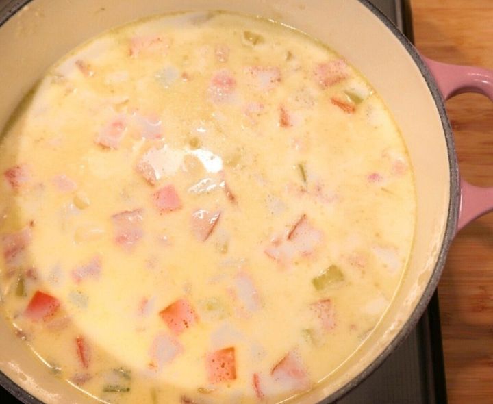 つづいて牛乳、ブイヨン(またはコンソメ)キューブを加えます。一度沸騰させてから弱火にし、ときどき混ぜながら約20分煮込みます。