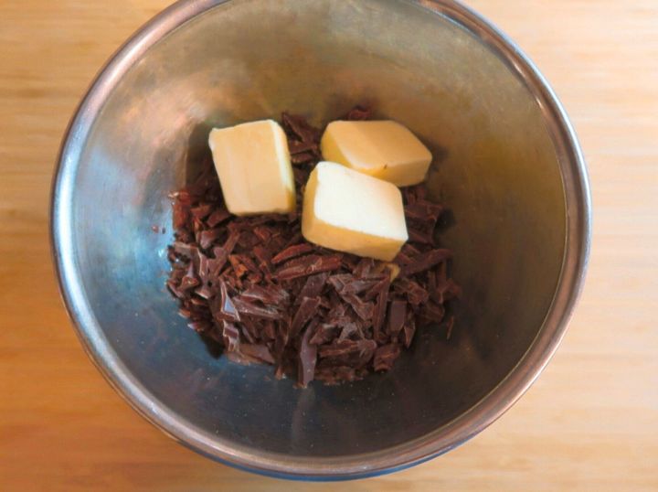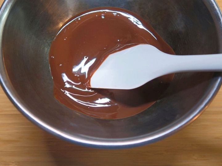 ボウルにチョコレートとバターを入れ、50~55度の湯せんにかけて溶かします。高温によりチョコレートの風味がとんでしまうのを防ぎます。