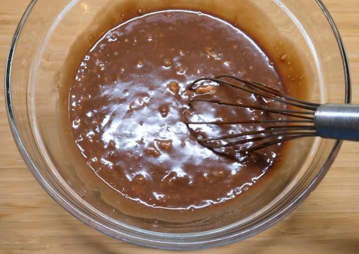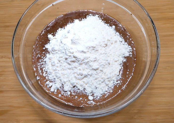 溶かしたチョコレートとバターを加えて、均一になるまでしっかりと混ぜ合わせます。