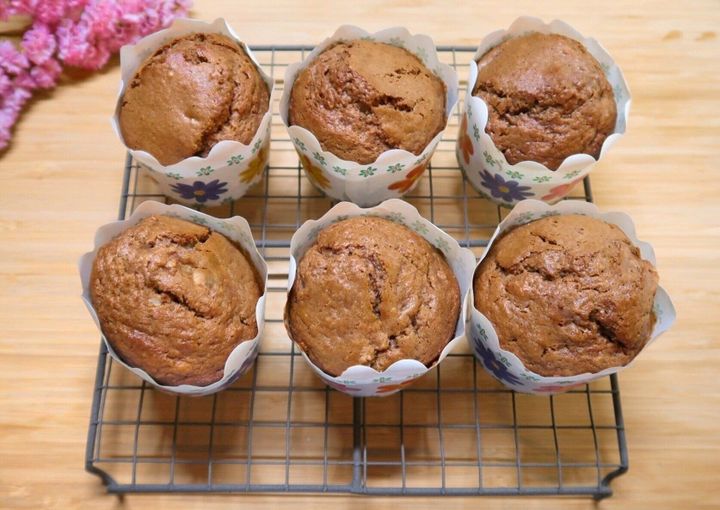 ホットケーキミックスを使用したチョコバナナマフィン。表面はさっくり、中はしっとり。チョコレートとバナナの風味が口いっぱいにひろがります!ぜひおうちでカフェ気分を味わってみてくださいね。