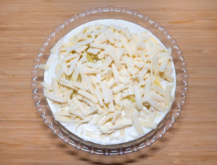加熱したじゃがいもに(3)のソースをかけ、ピザ用チーズを全体にのせます。オーブントースターでこんがりと焼き色がつくまで焼きます。