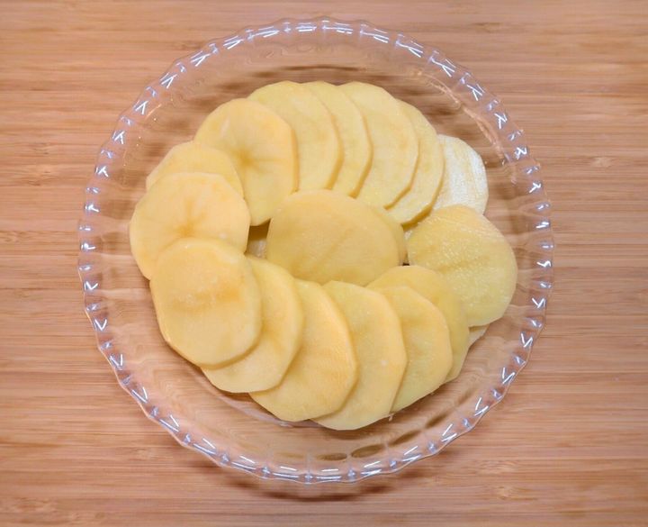 じゃがいもは皮をむいて芽を取り除き、5mm幅のうす切りにします。あえて水にさらさず、じゃがいものでんぷん質をいかしたクリーミーな口あたりに仕上げます。