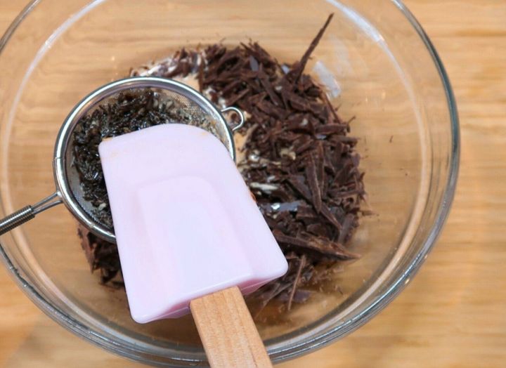 刻んだチョコレートに、(2)の生クリームを茶こしでこしながら注ぎます。茶こしにのこった茶葉をしぼるようにして、最後までしっかりこすのがポイントです!