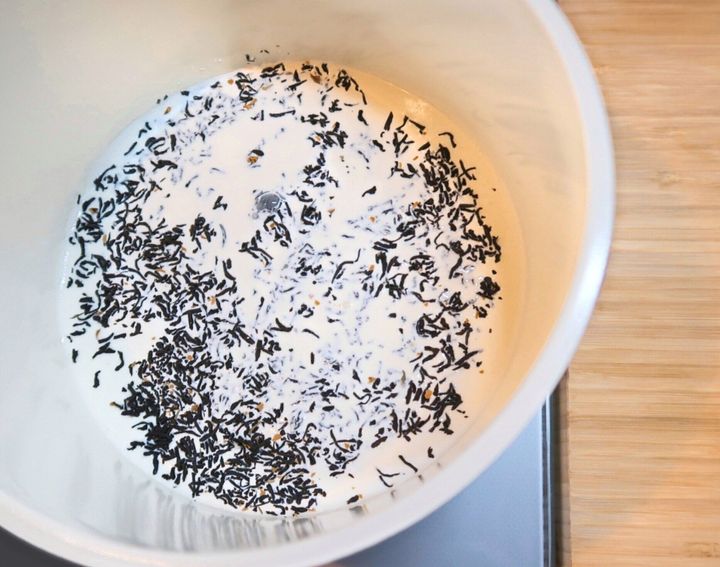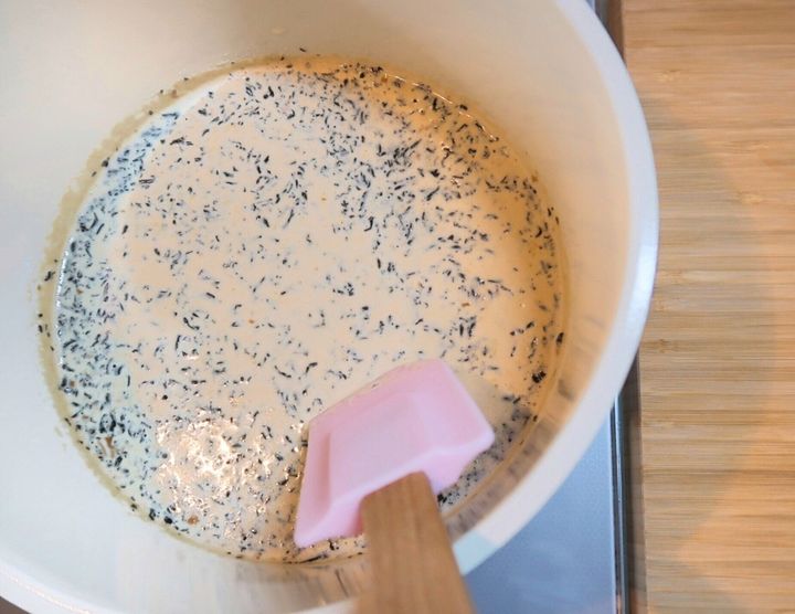 小さめの鍋に生クリーム、紅茶の茶葉を入れ、ときどき混ぜながら弱火にかけます。