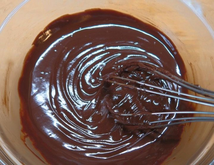 つづいて60度前後の湯せんにかけ、全体が均一になるまで泡立て器でよく混ぜ合わせます。高温によりチョコレートの風味がとんでしまうのを防ぎます。