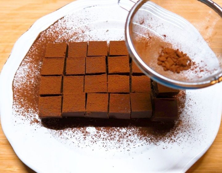 バット(またはお皿)に茶こしを使ってココアパウダーをふります。カットした生チョコをのせ、さらに表面全体にココアパウダーをふります。