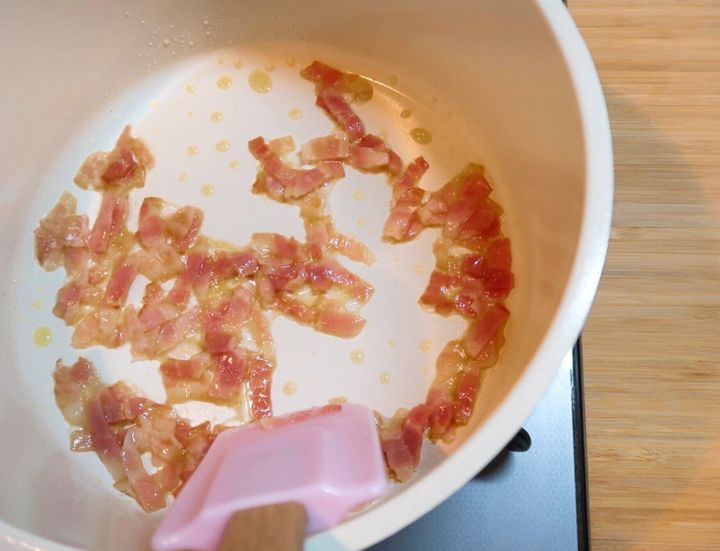なべにオリーブオイルを熱し、ベーコンを入れ弱めの中火で2〜3分炒めます。ここでベーコンの旨味をひきだします。