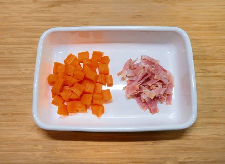 にんじんは皮をむき、約1cmの角切りにします。ベーコンは約5mm幅の細切りにします。