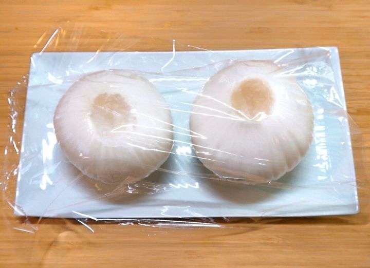 (1)の新玉ねぎを、くり抜いた面が上向きになるように耐熱皿にのせます。つづいてラップをかけて600Wの電子レンジで約5分加熱します。