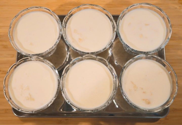 つづいてカップに注ぎます。果肉が沈んでいるため、おたまで底からすくいながら注ぐのがポイントです!ラップをかけて、冷蔵庫で約2時間冷やし固めます。