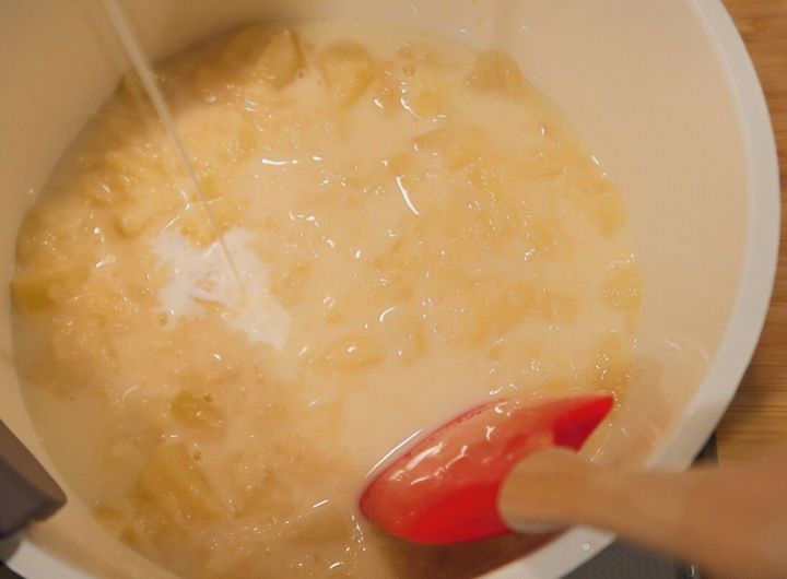 火を止め、ふやかしたゼラチンを加えて約30秒間よく混ぜ溶かします。ここでゼラチンを完全に溶かしておくことがポイントです!