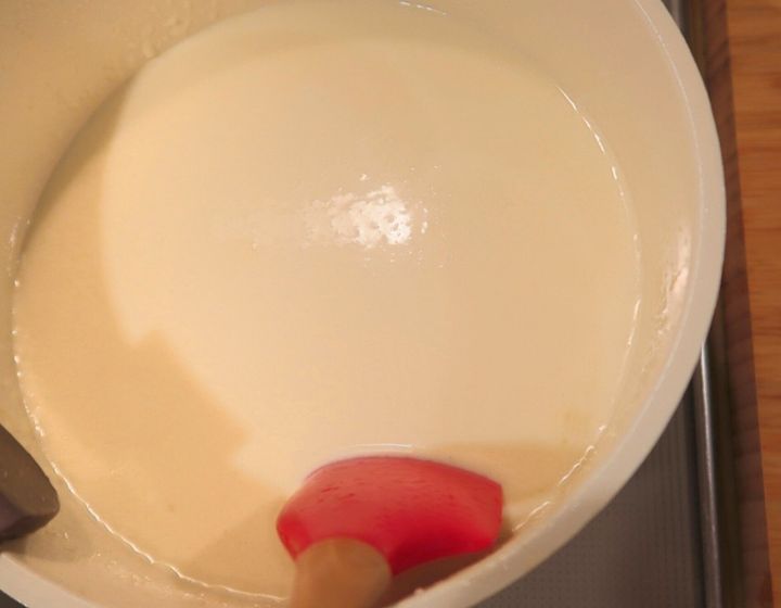 牛乳、生クリームを加えて全体を混ぜ合わせ、中火で約1分あたためます。