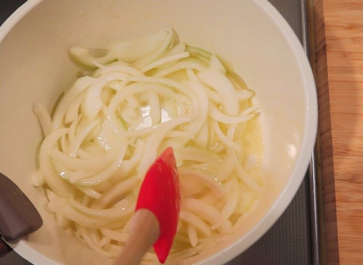 鍋にバターを中火で熱し、玉ねぎを3〜5分炒めます。じっくり炒めることで玉ねぎの甘みを引き出します!