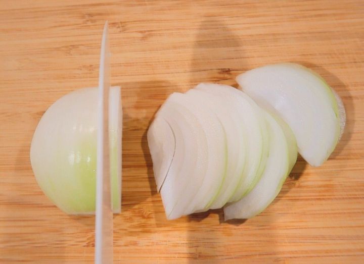 玉ねぎは皮をむいてスライスします。