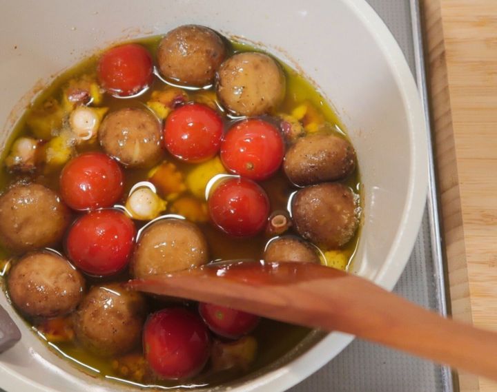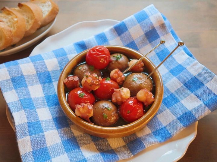 今回は、カルディのシーズニングを使った【タコとマッシュルームの本格アヒージョ】のつくり方をご紹介します。タコとマッシュルームの旨味と、ミニトマトのジューシーな味わいが口いっぱいにひろがります!