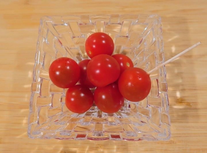 ミニトマトはヘタを取り除き、水洗いしてキッチンペーパーで水気をふきとります。つづいて爪楊枝で約3箇所に穴を開けます。