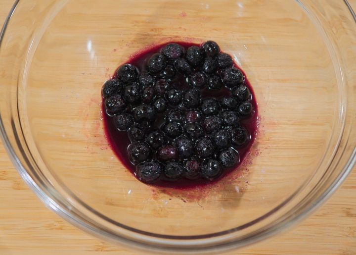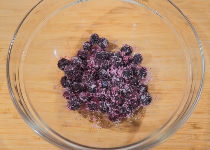 耐熱ボウルに冷凍ブルーベリー、砂糖の半量(30g)を加え混ぜ合わせます。