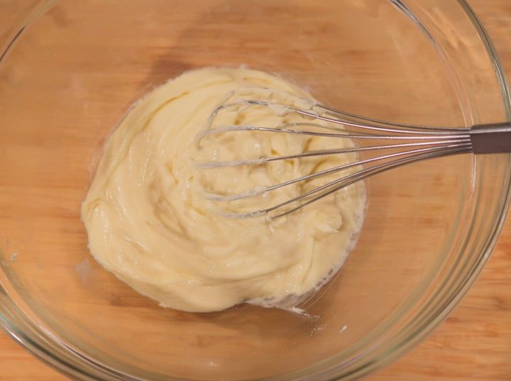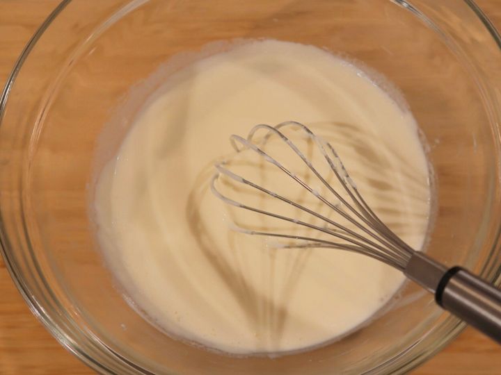 とろっとした液体状になったらレアチーズケーキの材料が入ったボウルに加え、均一になるまでよく混ぜ合わせます。