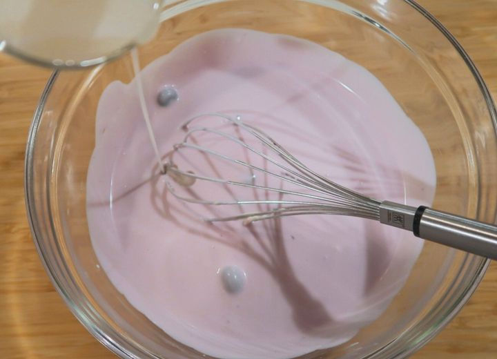 つづいて、(2)のブルーベリーソースを加えよく混ぜます。