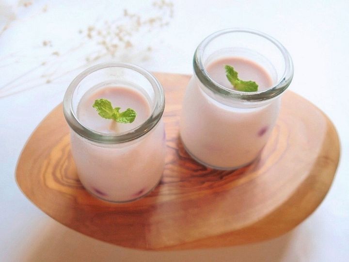 冷蔵庫から出しお好みでミントの葉をのせたら、「ブルーベリーのカップレアチーズケーキ」の完成です!ブルーベリーのジューシーな果実味と、クリームチーズの濃厚な味わいが口いっぱいにひろがります。