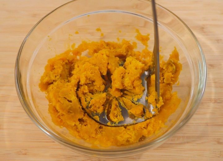 かぼちゃが熱いうちにマッシャー(または大きめのフォーク)でつぶします。