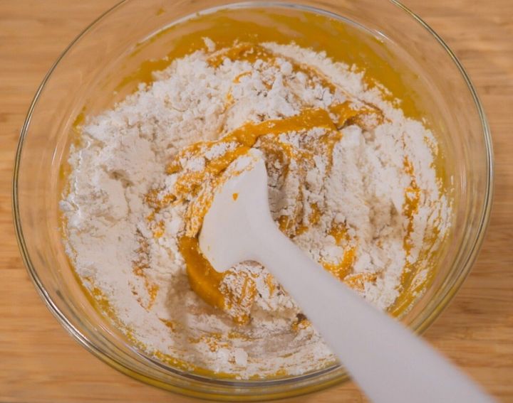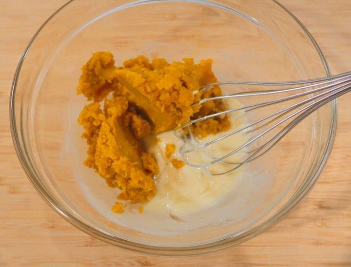 つぶしたかぼちゃを加えてよく混ぜ合わせます。