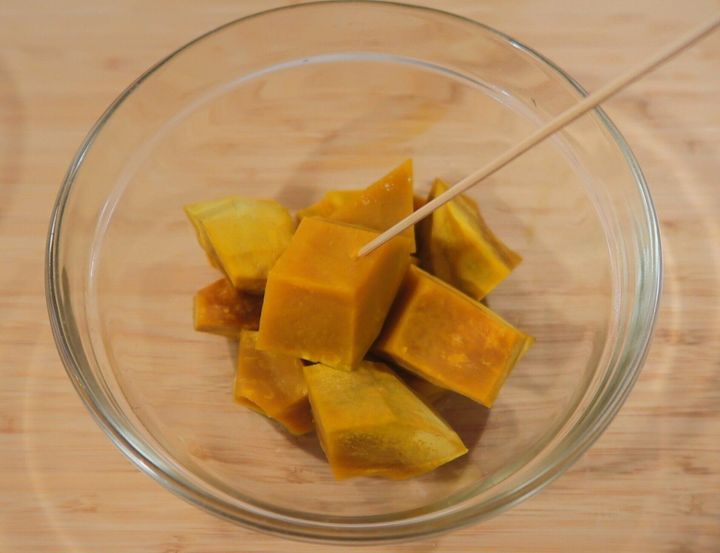 かぼちゃに竹串をさして、すっと通るくらいのやわらかさになればOK!