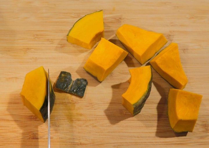 種とわたを取り除いたかぼちゃを約3cm角に切ります。つづいて包丁でそぐようにして皮をむきます。