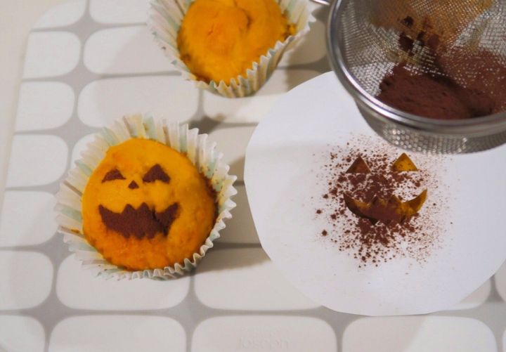 紙にお好みの顔を描きカッターナイフで切り抜きます。粗熱がとれたマフィンの上にのせ、茶こしを使ってココアパウダーをふりかけます。