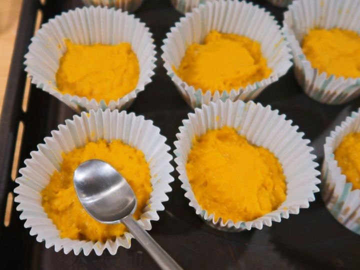 オーブンから取り出し、網の上にのせて冷ましたら「かぼちゃマフィン」の完成です!完全に冷めてからラップで包み、冷蔵庫で2〜3日間保存可能です。