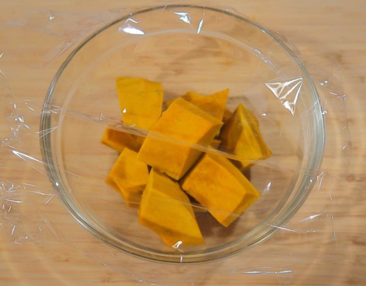 カットしたかぼちゃを耐熱ボウルに入れ、ふんわりとラップをかけて電子レンジ(600w)で約5分加熱します。