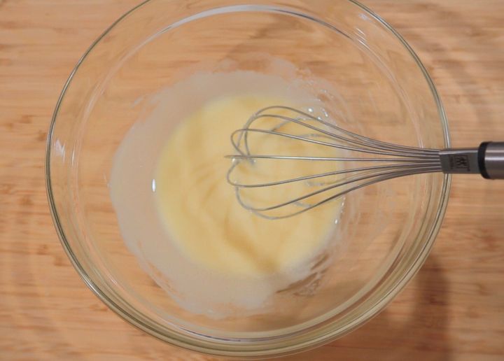 卵はしっかりと溶きほぐします。はしで白身をつまむようにすると均一に混ざりやすくなります!