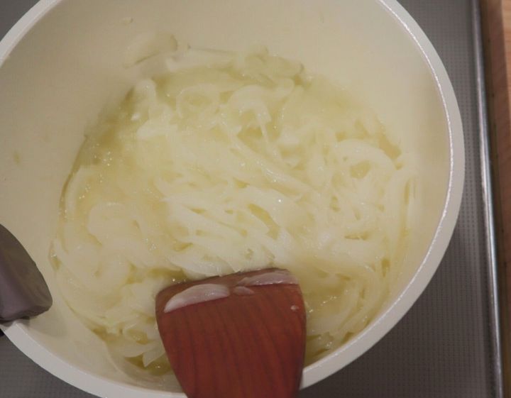 鍋を中火で熱し、(1)の新玉ねぎを加えて約5分炒めます。ここで玉ねぎの水分をとばすのがポイントです!