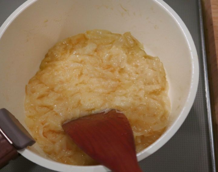 つづいてバター(30g)を加え、ときどき混ぜながら弱めの中火で25〜30分炒めます。