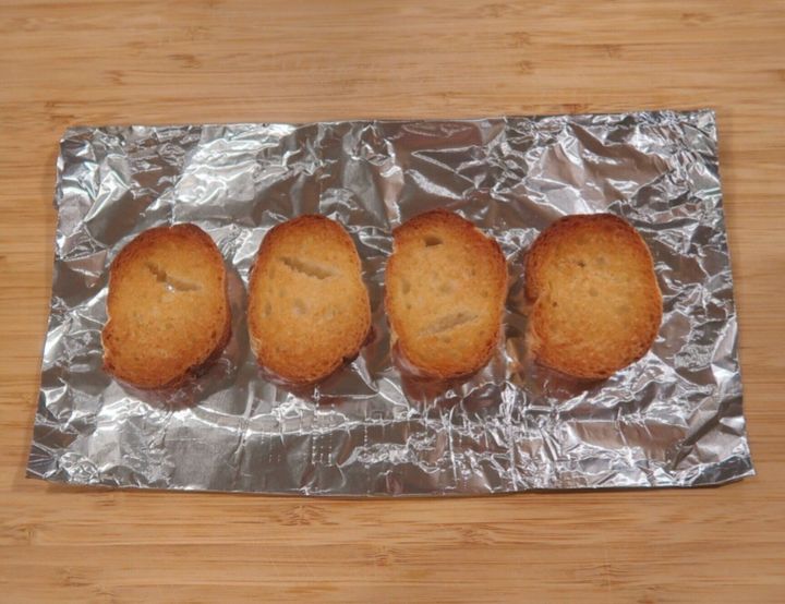 カットしたバゲットをオーブントースターでこんがり色づくまで焼きます。カリッと焼くことで水分がとび、よりスープがしみ込みやすくなります!