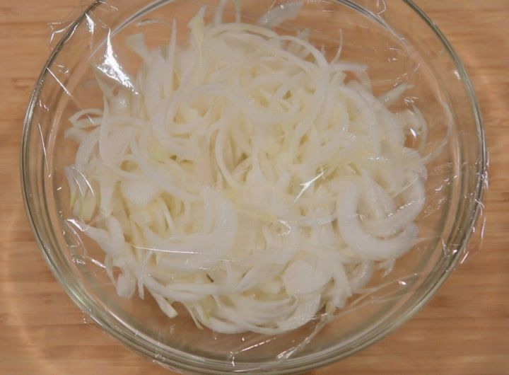 カットした新玉ねぎを耐熱ボウルに入れ、オリーブオイル(小さじ2)と塩ひとつまみ(分量外)を加え全体をよく混ぜ合わせます。つづいてふんわりとラップをかけ、電子レンジ(600w)で約4分あたためます。