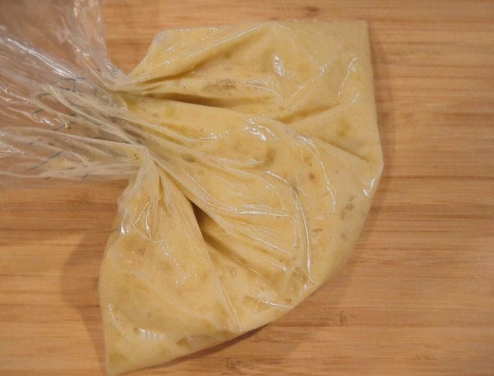 バナナは皮をむいて、ジッパー付きポリ袋に入れます。つづいて、なめらかになるまで手でよくもみます。
