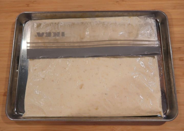 空気を抜いてジッパーを閉じ、バット(またはお皿)にのせます。平らにならし、冷凍庫で約1時間半冷やします。