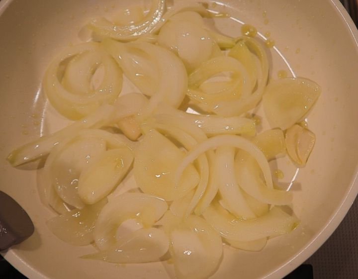 にんにくの香りがたったら、新玉ねぎを入れ中火で約3分炒めます。