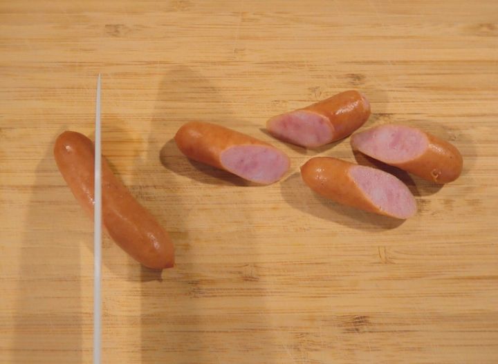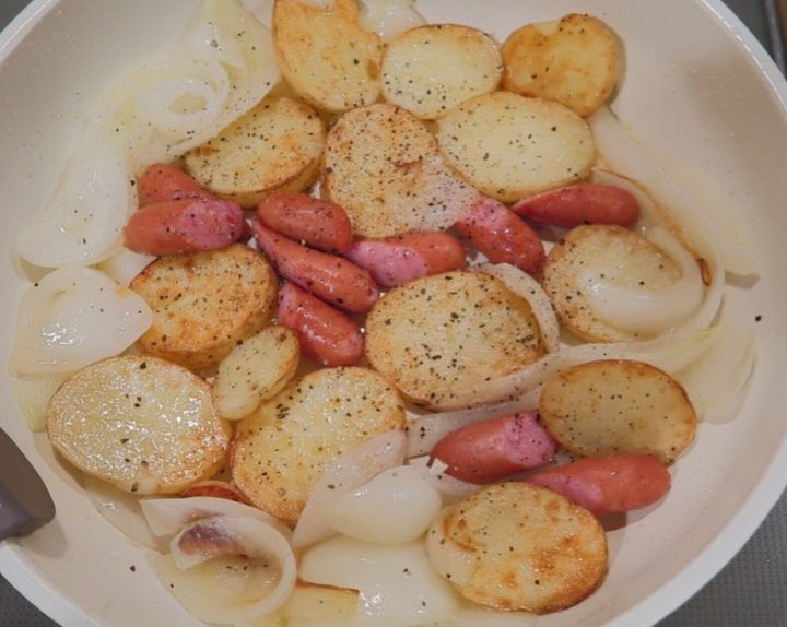 つづいてウインナーをフライパンのすき間にのせ、さらに中火で約4分焼きます。ウインナーをときどき転がして旨味を引き出します!