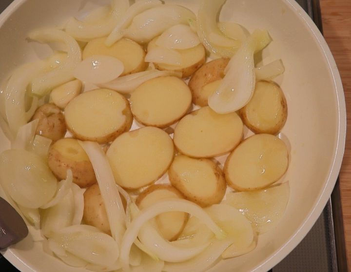 新玉ねぎが透き通ったら新じゃがを加え、焼き色がつきやすいよう底に広げて並べます。ときどきフライパンをゆすりながら、中火で3〜4分焼きます。