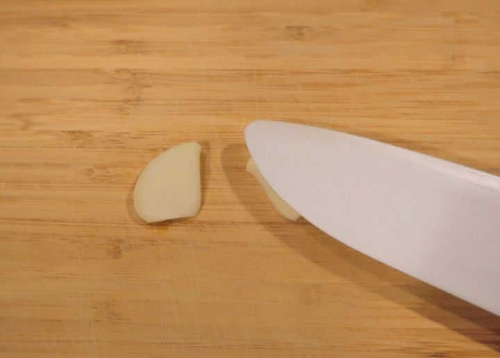 つづいて切り口を下向きにし、刃を奥に向けて包丁の腹をのせ手のひらで押しつぶします。このひと手間で、にんにくの香りが出やすくなります!