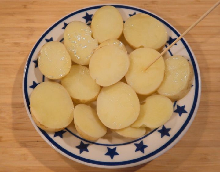 竹串がスッとささるくらいのやわらかさになればOK!油はねを防ぐため、キッチンペーパーで新じゃがの水分をふき取ります。