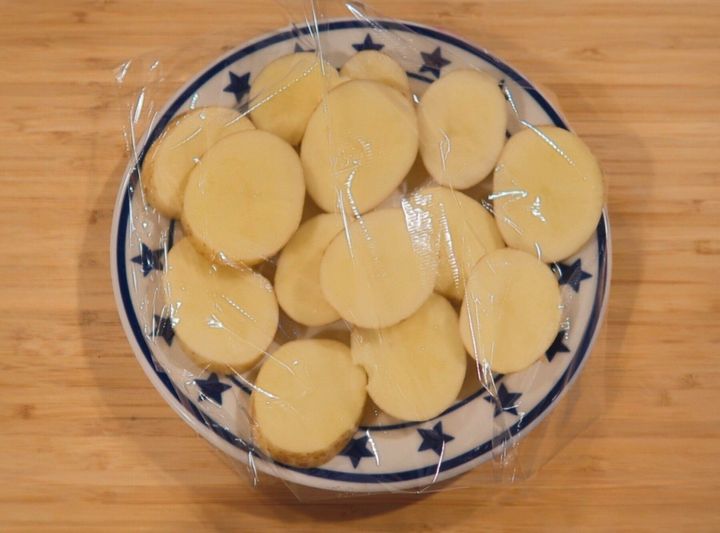 耐熱皿になるべく重ならないように並べ、ふんわりとラップをかけて電子レンジ(600w)で約4分加熱します。
