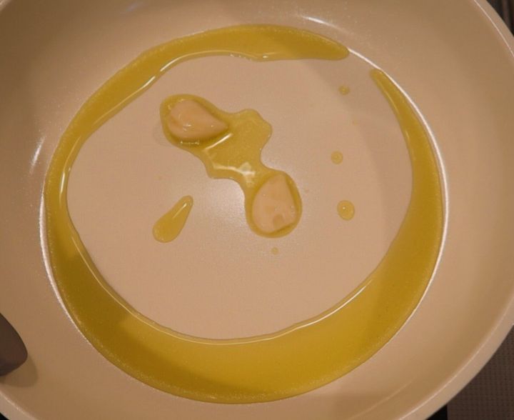 大きめのフライパンにオリーブオイル、にんにくを入れ中火にかけます。フライパンをまわしながら約2分加熱し、にんにくの香りをオリーブオイルにうつします。